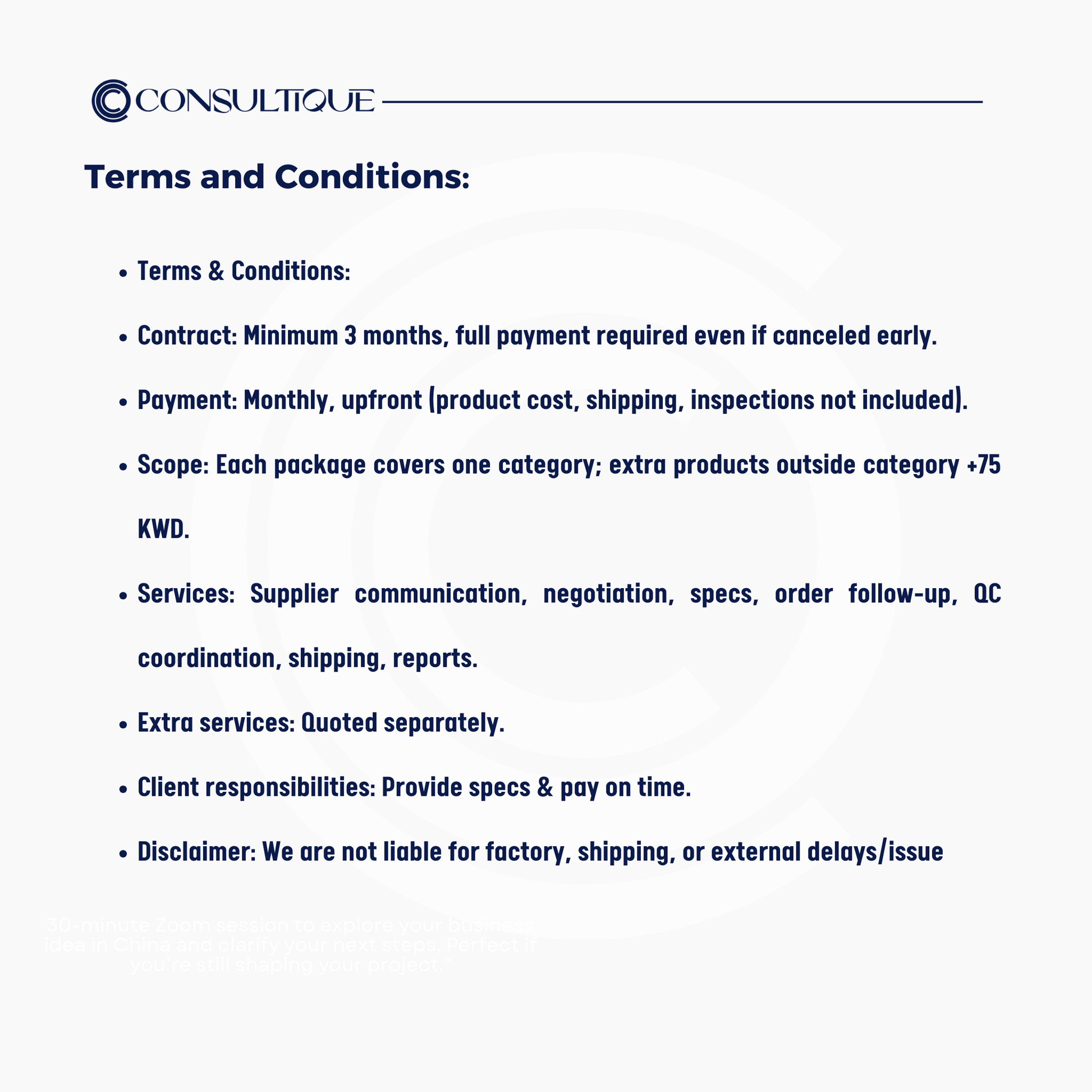 • إدارة عملية تحديد المواصفات (الخامة، اللون، الحجم، التغليف) بما يتناسب مع متطلبات مشروعك.